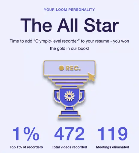 Similar to Spotify Wrapped, Loom recently sent out its end-of-year report. I was titled a Loom All-Star, creating 472 unique videos and ranking in the top 1% of all recorders.