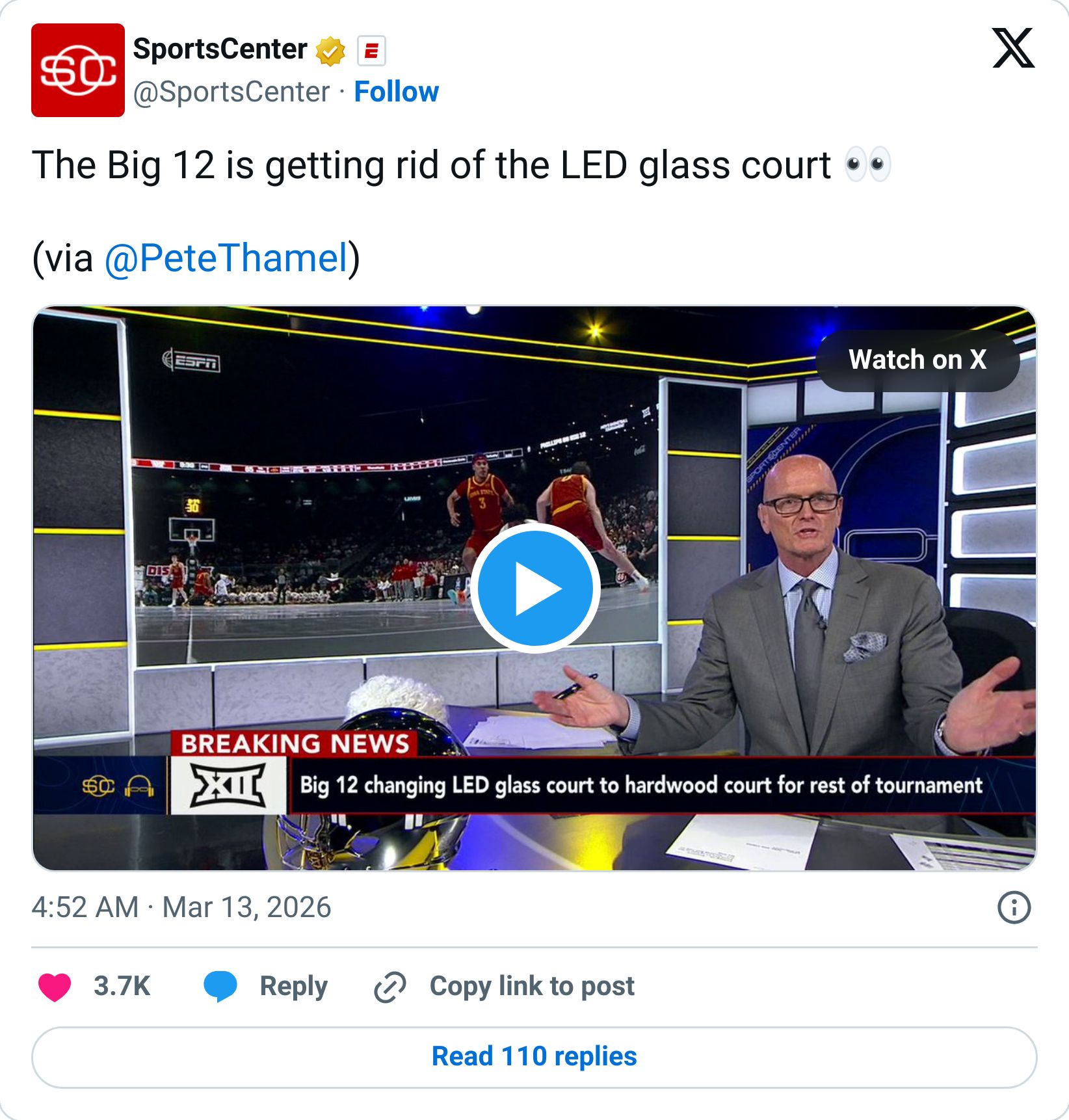 The Big 12 tournament in Kansas City debuted a full LED glass floor. The entire court is a screen. Controlled from an iPad. Team logos morph during intros. A shattered-glass animation fires after dunks. Sponsorships rotate in real time beneath the players’ feet.