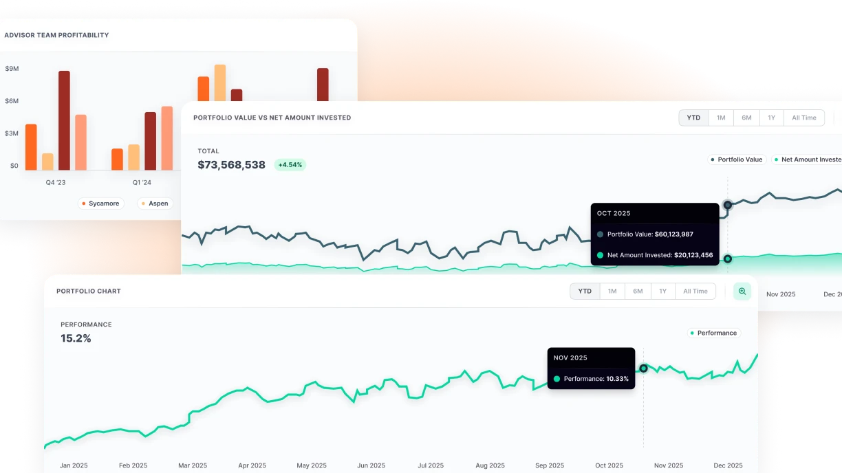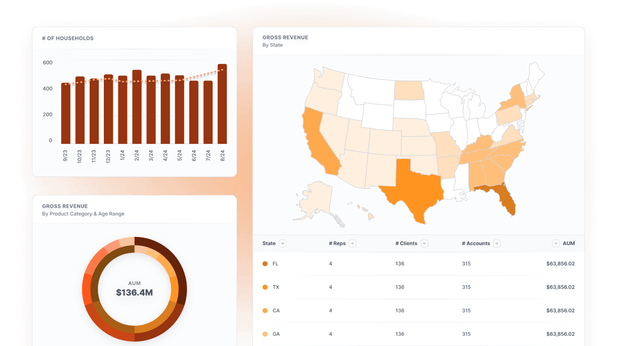 Revenue trends by advisor, office, & service line with growth trajectories